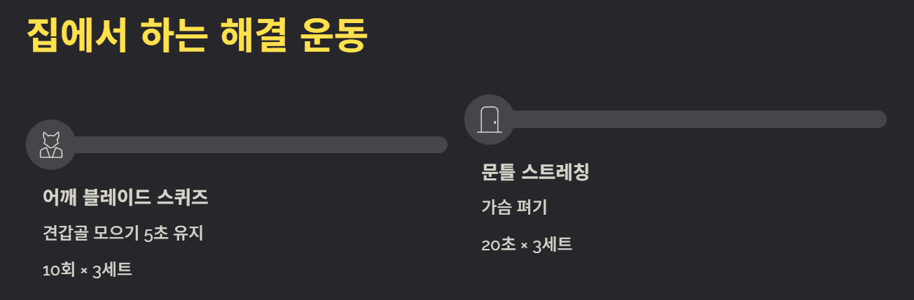 “거북목이 심해서 늘 결렸는데, 문틀 스트레칭과 승모근 스트레칭을 꾸준히 하니까 하루하루 가벼워지는 걸 느꼈어요.”