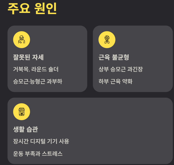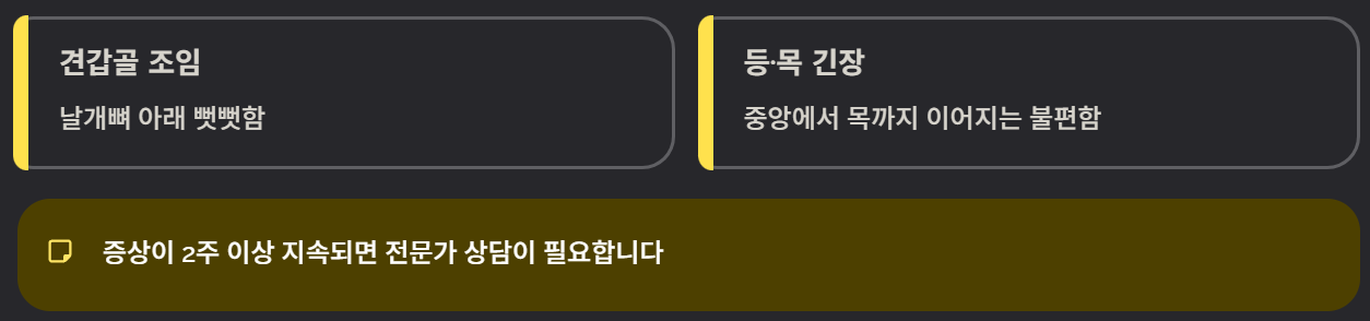 이러한 증상이 반복된다면 근육 피로 누적 또는 자세 패턴 문제가 원인일 가능성이 높습니다.