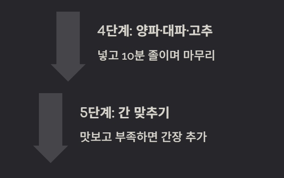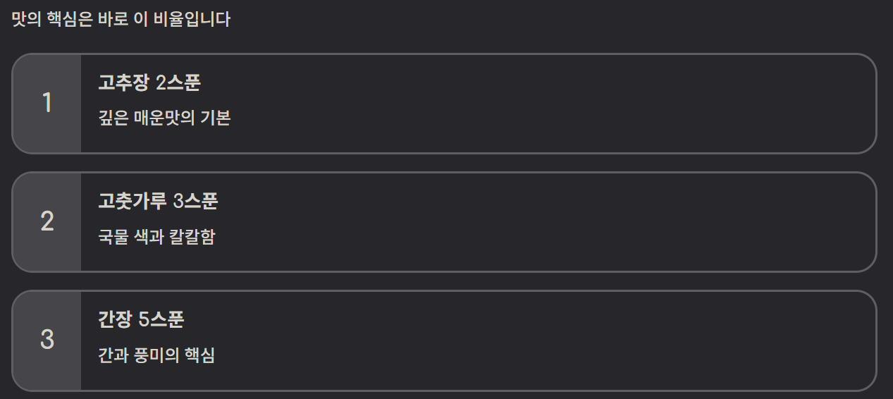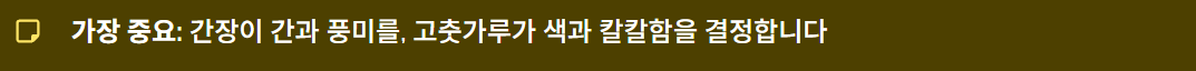 가장 중요한 핵심: 간장의 양이 간·풍미를 결정하고, 고춧가루의 양이 국물의 색과 칼칼함을 좌우합니다.
