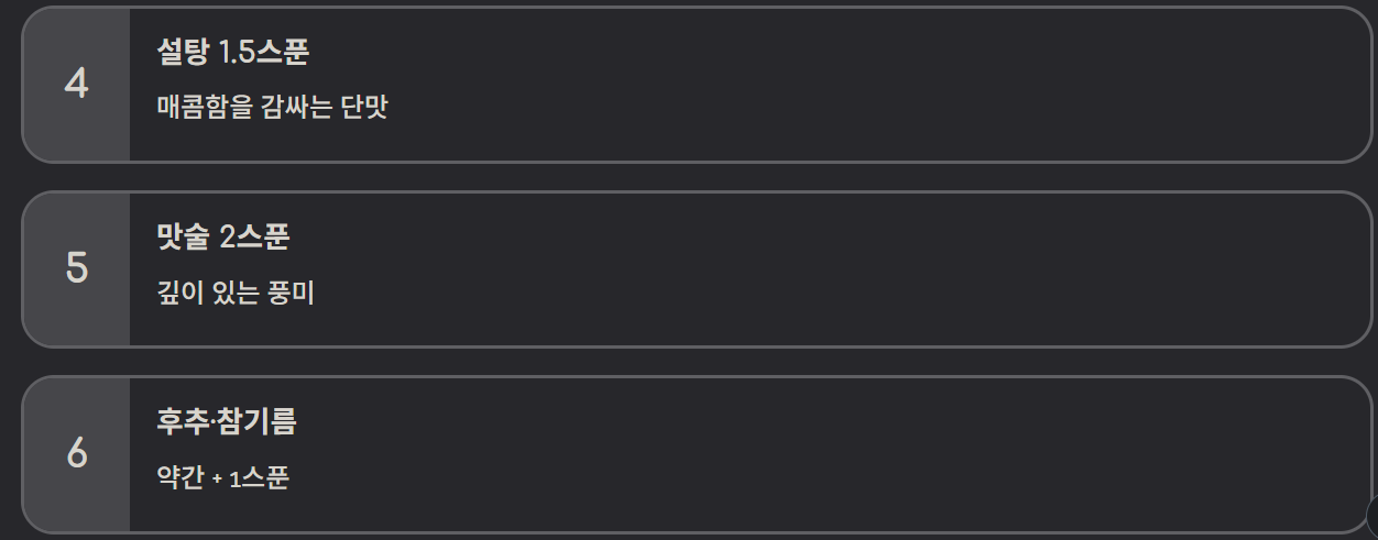 마지막에 간을 보고 부족하면 간장 또는 고춧가루를 소량 추가합니다.