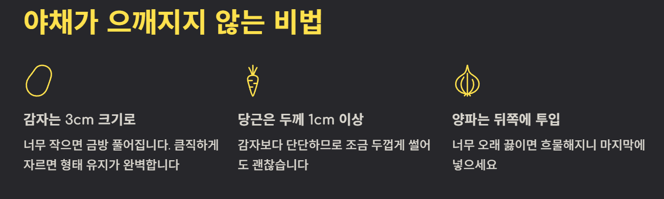 팁: 감자는 3cm 크기로 잘라야 으스러지지 않고 형태를 잘 유지합니다.