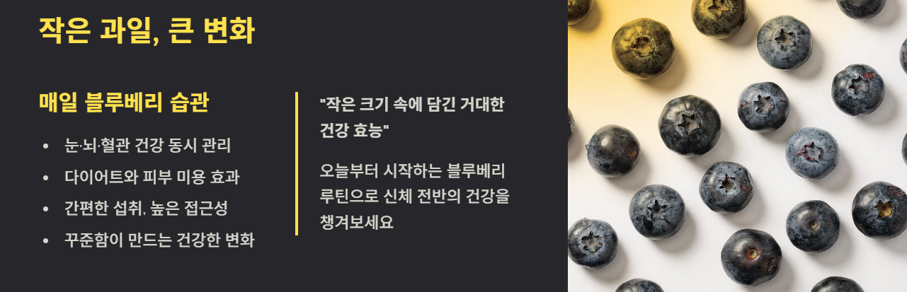 블루베리는 작은 크기 속에 눈 건강, 항산화, 다이어트, 면역력 등 다양한 효능을 담고 있는 대표적인 건강 과일입니다. 매일 조금씩 꾸준히 섭취한다면 신체 전반의 건강 관리에 큰 도움이 될 수 있습니다. 특히 간편하게 먹을 수 있어 일상 속 습관처럼 챙기기 좋은 식품입니다.