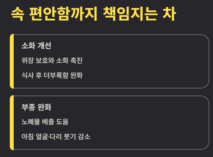 식사 후 더부룩함을 줄여주며 장 기능을 부드럽게 돕습니다. 예민한 위를 가진 사람들도 부담 없이 마실 수 있는 부드러운 차입니다.