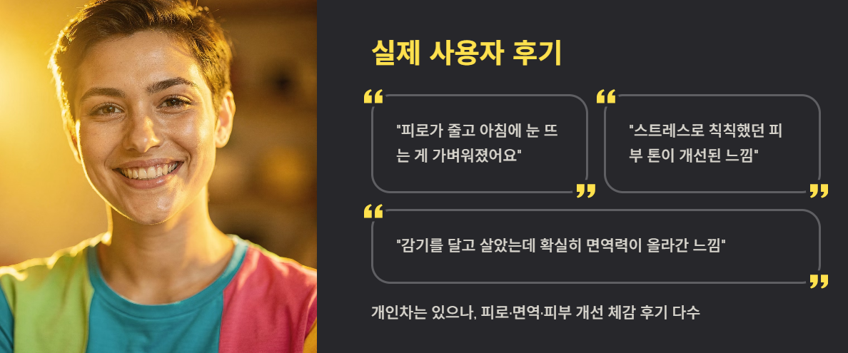 개인차가 있으나, 다수가 피로·면역·피부 개선을 체감했다는 공통된 리뷰가 많습니다.