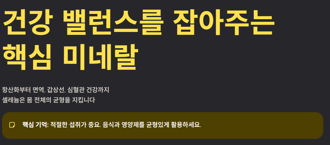 셀레늄은 우리 몸에서 항산화 작용과 면역 균형을 유지하는 데 핵심적인 미량 미네랄 중 하나입니다.