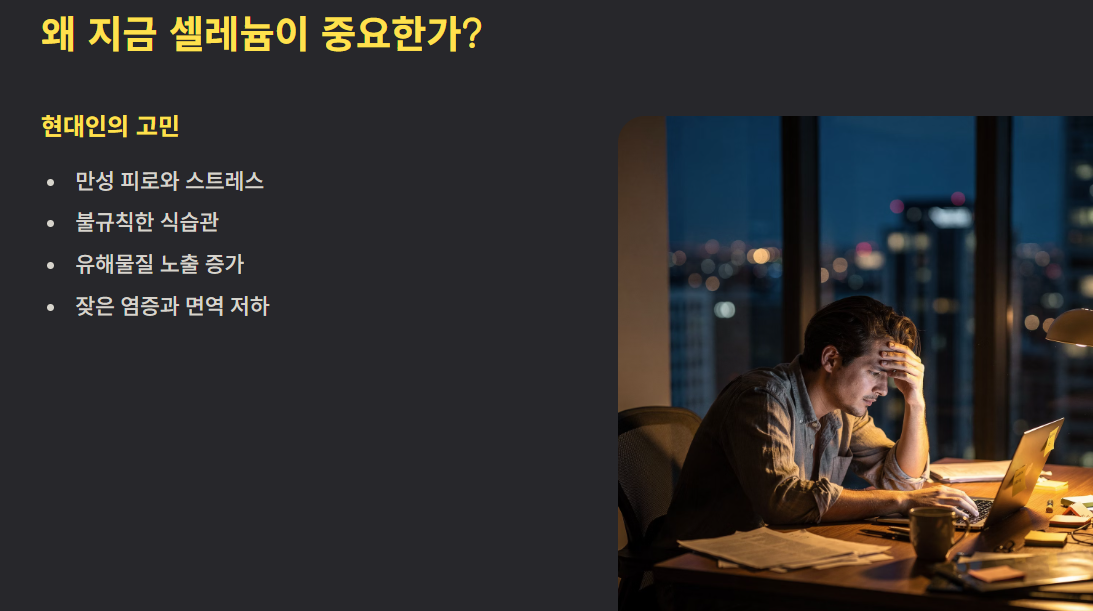 셀레늄은 대표적인 항산화 효소인 글루타티온 퍼옥시다제(GPx) 활성에 중요한 역할을 합니다. 활성산소가 증가하면 피부 노화, 만성 피로, 염증 등이 발생하는데 셀레늄은 이를 억제해 세포 손상을 줄여줍니다. 따라서 ‘피곤함이 누적된 느낌’이 있는 사람들에게 도움이 될 수 있습니다.
