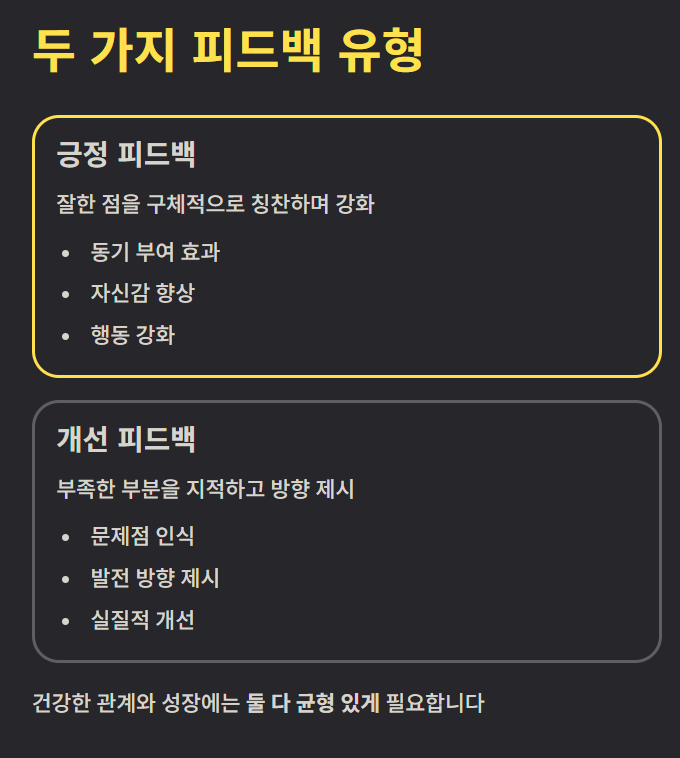 - 부정 피드백(개선 피드백) – 부족한 부분을 지적하고 개선 방향을 제시