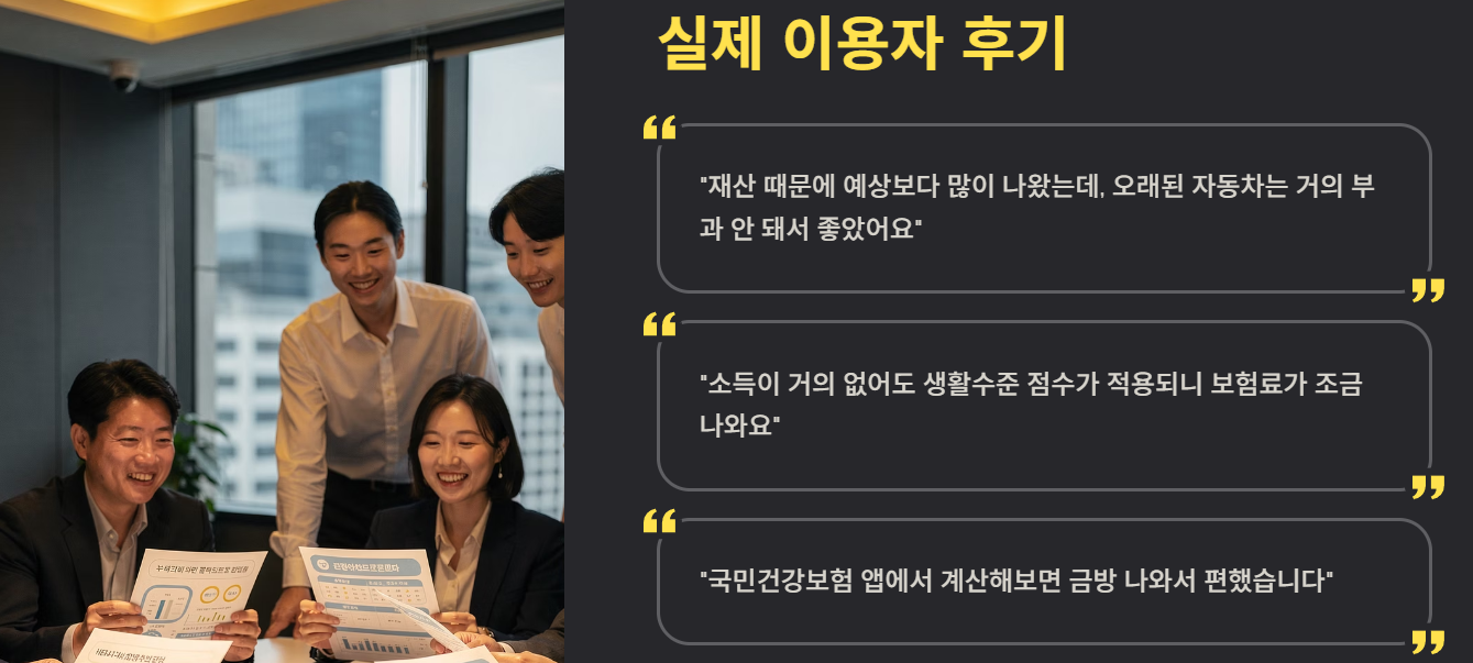 - “재산 때문에 보험료가 예상보다 많이 나왔는데, 자동차 오래된 건 거의 부과 안 돼서 좋았어요.”
