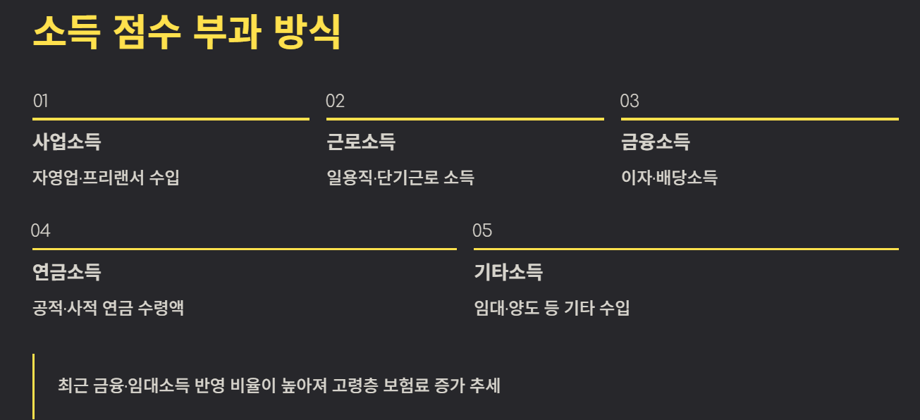 소득금액에 따라 점수가 부여되고, 이 점수에 건강보험료 단가를 곱해 보험료가 산정됩니다. 특히 최근에는 금융·임대소득 반영 비율이 높아져 소득이 있는 고령층의 보험료가 증가하는 경우도 많습니다.