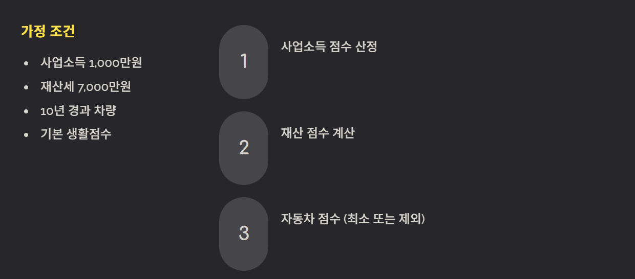 등이 평가 요소이며, 경차·저가 차량·오래된 차량은 대부분 제외되거나 부과 점수가 매우 낮습니다. 반면 고가 차량을 보유하면 점수가 크게 증가합니다.