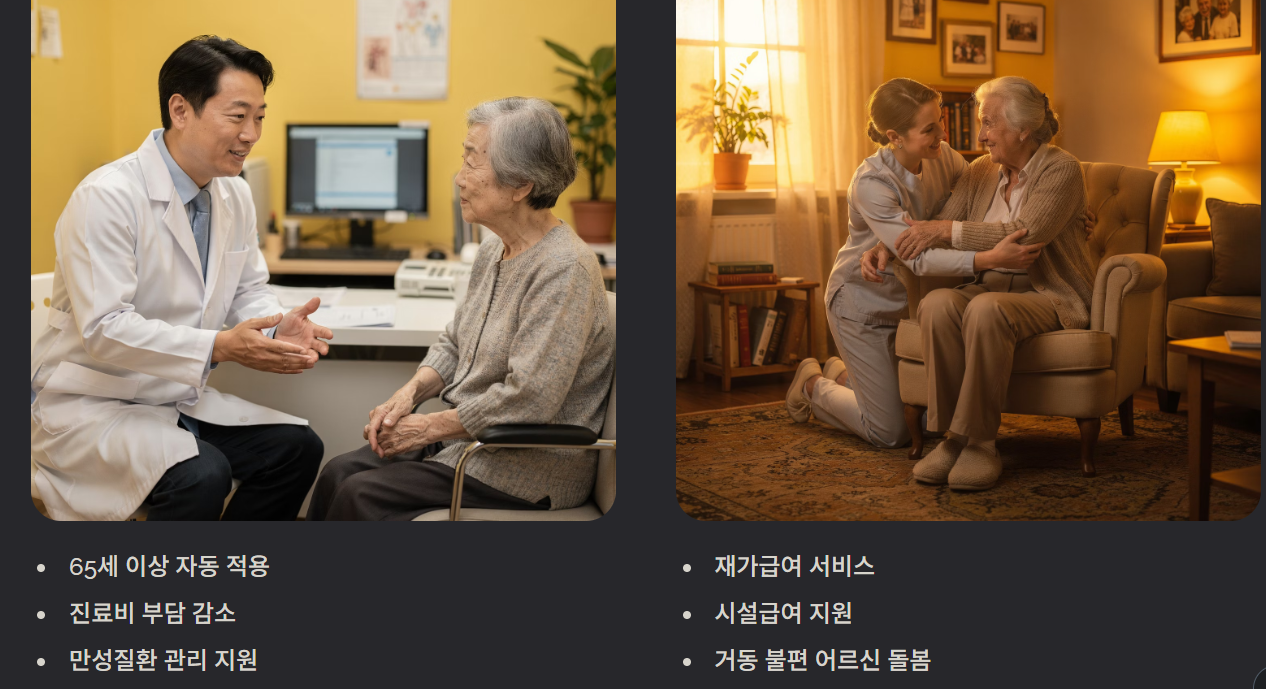 65세 이상일 경우 건강보험 혜택이 확대돼 본인부담금이 경감되는 경우가 많습니다. 또한 장기요양등급을 받으면 재가급여, 시설급여 등 다양한 돌봄 서비스를 저렴하게 지원받을 수 있습니다. 특히 거동이 불편한 어르신에게 큰 도움이 됩니다.