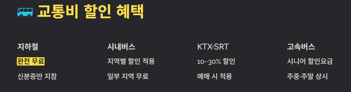 65세 이상 노인은 지하철 무료, 시내버스 일부 지역 할인, 고속버스·철도 할인 등 다양한 교통 혜택을 받을 수 있습니다. 지하철은 신분증만 있으면 바로 이용 가능하며 KTX는 약 10~30% 할인 혜택이 제공됩니다. 이동이 많은 어르신들에게 실속 있는 혜택입니다.