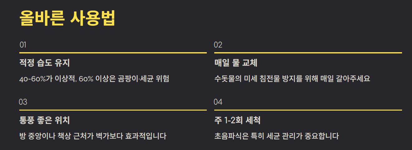 60% 이상이면 오히려 곰팡이·세균 번식 위험이 증가합니다. - 수돗물을 매일 갈기