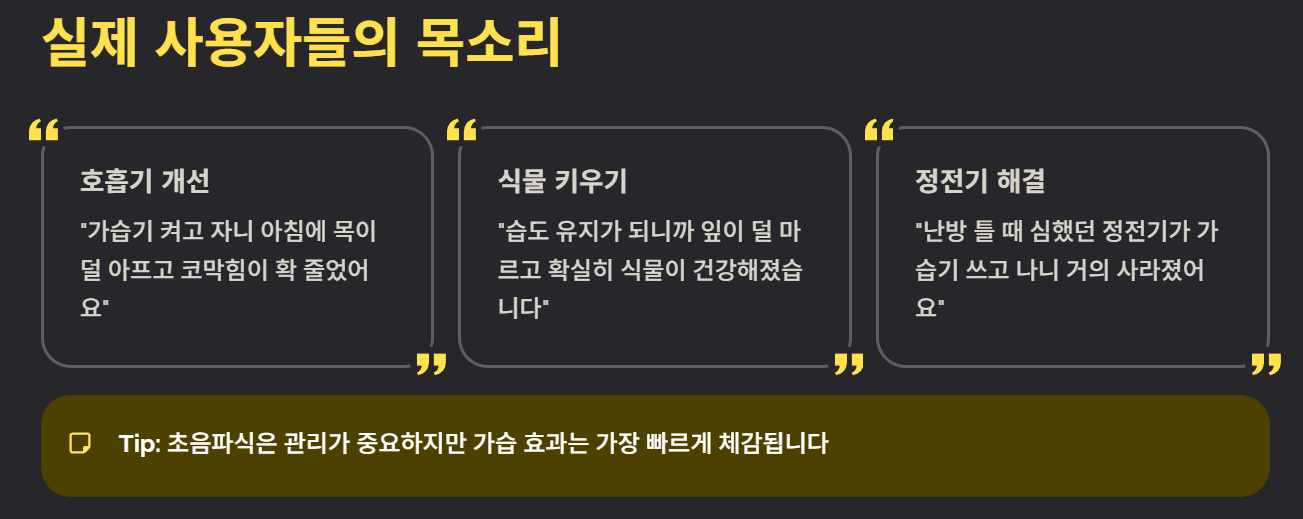 - “가습기 켜고 자니 아침에 목이 덜 아프고 코막힘이 확 줄었다.”
