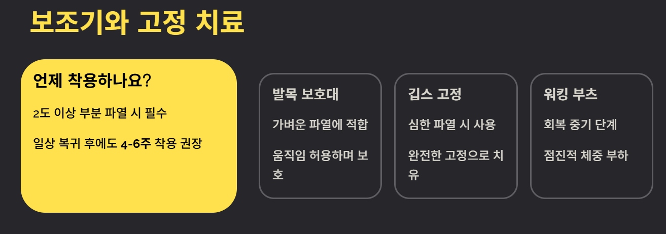 부분 파열 이상일 경우 발목 보호대를 착용하거나 깁스로 고정합니다. 무리한 움직임은 회복기간을 늘릴 수 있습니다.