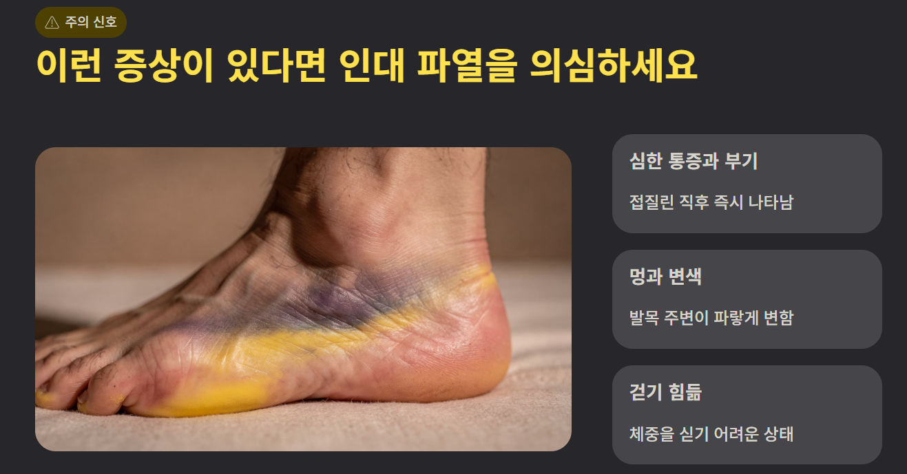 심한 통증, 붓기, 멍, 체중 부하 시 통증이 특징입니다. 걷기 힘들 정도라면 병원 진료가 필요합니다.